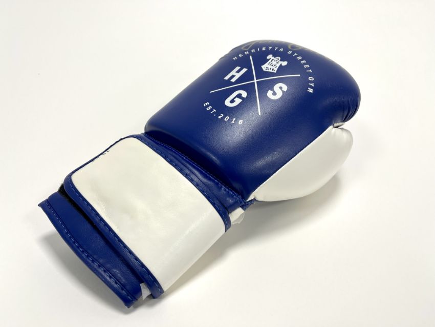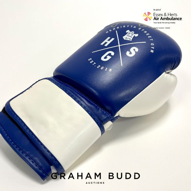 blue and white glove printed with HENRIETTA STREET GYM emblem, signed in silver marker pen
