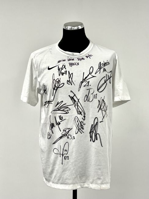 Nike, short-sleeved signed in black marker pen on the front by approximately 19 squad members including Hernandez, Mbappe, Kimpembe, and others, size L, see extra image of Hugo Lloris with the signed t-shirt, not match/training worn