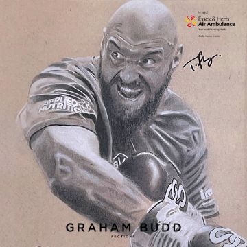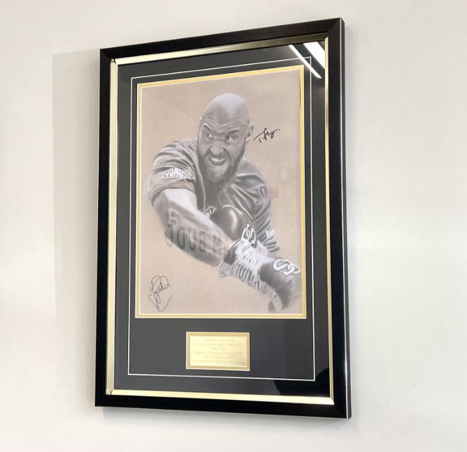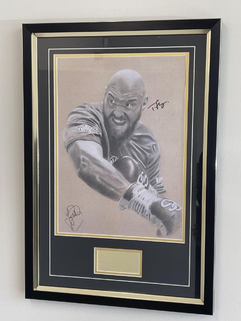 featuring Tyson Fury in fighting pose wearing a training top and gloves, signed by artist and boxer in black marker pen, mounted above a engraved plaque, glazed and framed, 64 by 44cm overall, with Maximus Memorabilia COA to reverse of frame