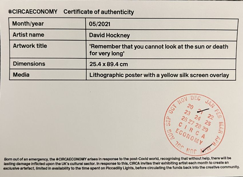 David Hockney OM CH RA (British, b.1937) 'Remember You Cannot Look At The Sun Or Death For Very Long', 2021, Lithographic poster with a yellow silkscreen overlay. Bears David Hockney Circa Economy label verso. Edition 2751 of 3000. Unframed, measures 89.4 by 25.4cm. Sold with Circa Economy Certificate of Authenticity. Good Condition.