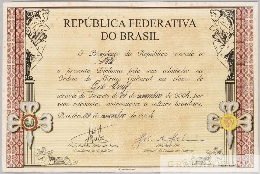 at a ceremony also attended by Gilberto Gil the Brazilian Government’s Minister of Culture, a four-piece set, comprising the order in gilt & enamel to be hung over the shoulder by long red satin ribbon with rosette; another order in gilt & enamel in the form of a large badge with gilt eight-point .star, brooch fitting; a bar pin in gilt & red satin with stud fittings; and a gilt and red satin lapel pin with stud fitting, the bar indicates it is a "Knight" degree of the Order, the design incorporating a Cross of Saint James of the Sword (70 by 60mm.) , enamelled in white, outlined in gold, the centre featuring an open book in gold flanked by laurel and encircled in red enamel with the legend "ORDEM DO MÉRITO CULTURAL" all pieces issued in a red velvet case measuring 28 by 18.5 by 7.5cm., fine condition; sold together with the diploma for the presentation in red velvet hardbound folder (2)