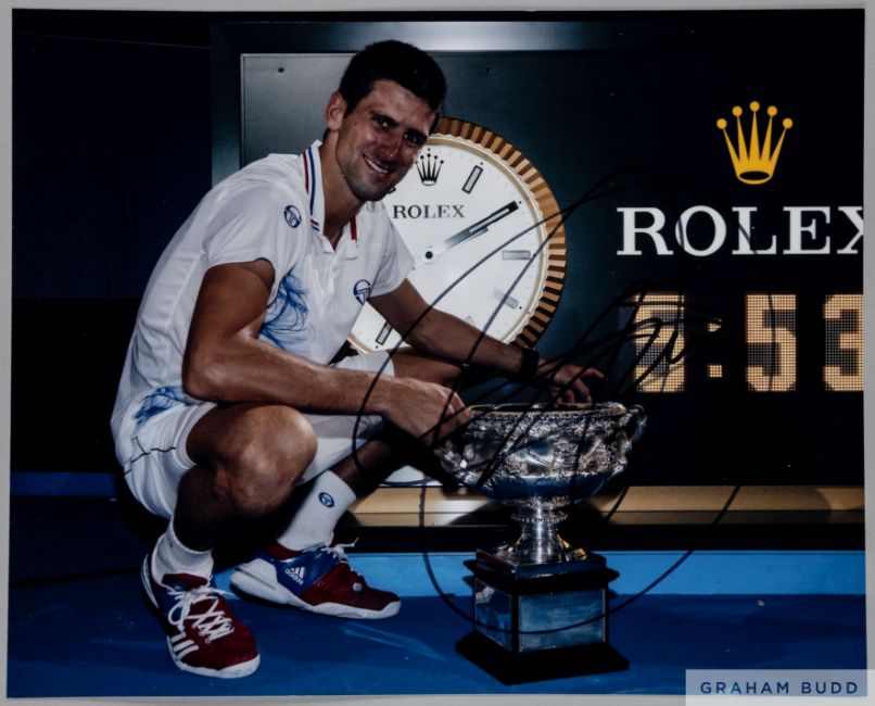 depicting Djokovic posing with the Australian Open trophy which he has won for a record nine times nicely signed in black pen by Djokovic to the central portion of the image,