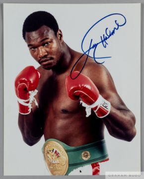 Larry Holmes World Heavyweight Boxing Champion 1978-85 original autographed colour 10 by 8in. photograph,