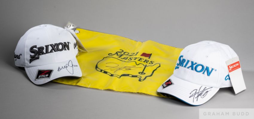 Hideki Matsuyama signed white Srixon tour staff capthe peak signed and another similar autographed by Graeme McDowell and Graeme McDowell signed 2021 Master flag (3)