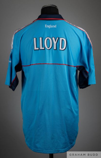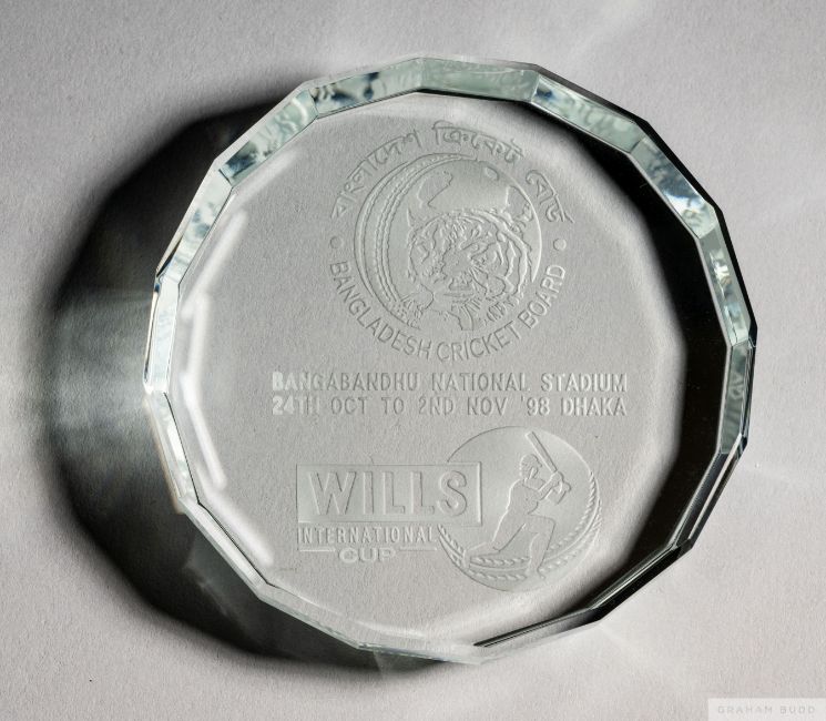 David Lloyd blue Wills International Cup shirt, Asics, XL, with button-up collar and embroidered three lion badge and Wills International Cup badge, the reverse lettered LLOYD and associated glass paperweight inscribed Bangabandhu National Stadium, 24th Oct to 2nd Nov '98 Dhaka in original fitted case (2)The following Lots 187 to 221 relate to the cricket career of David "Bumble" Lloyd. See player bio at foot of description for Lot 187Provenance: David Lloyd