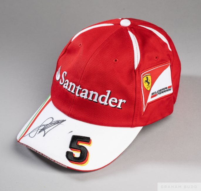 Sebastian Vettel signed red and white Ferrari F1 capthe peak embroidered 5 and signed