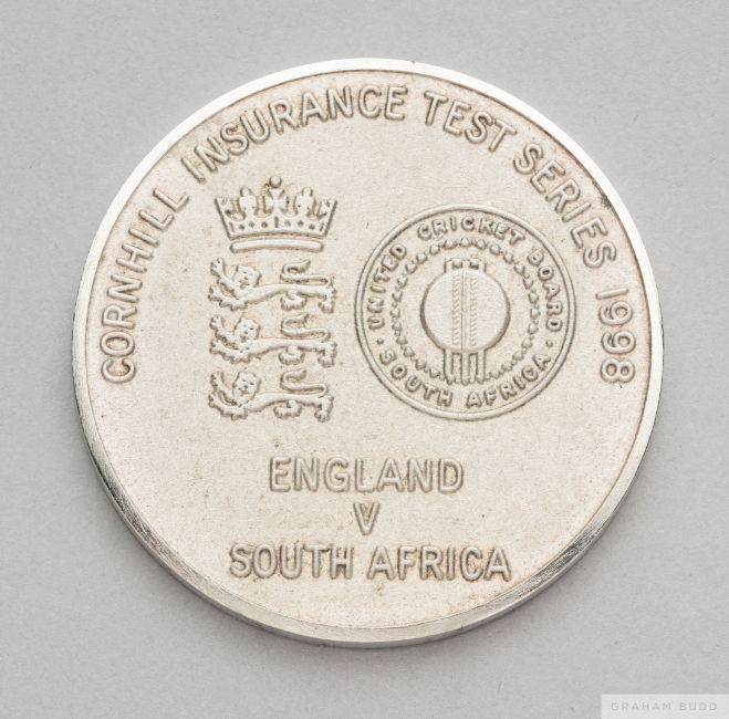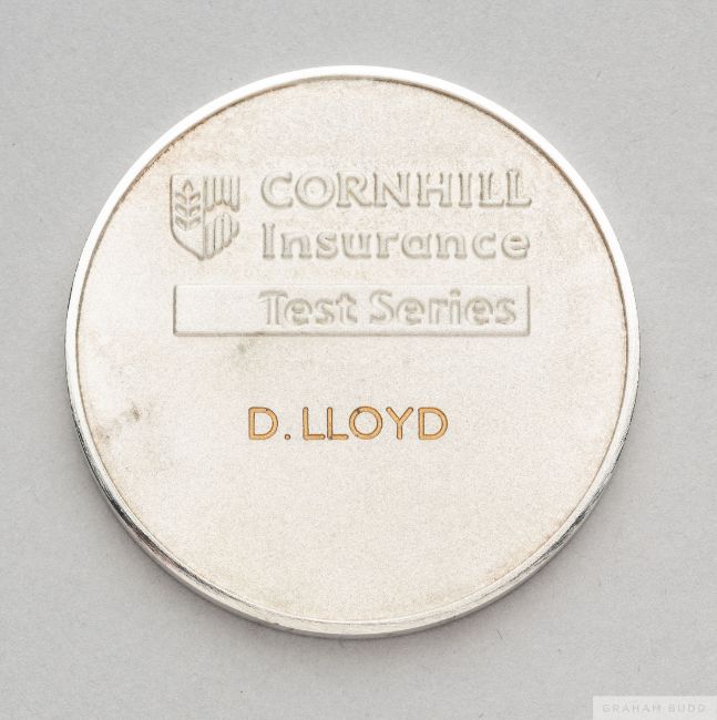 David Lloyd white-metal 1998 Cornhill Insurance Test Series medalthe obverse inscribed Cornhill Insurance Test 1998, ENGLAND V. SOUTH AFRICA, the reverse inscribed CORNHILL Insurance, Test Series, D. LLOYD, in original fitted caseThe following Lots 187 to 221 relate to the cricket career of David "Bumble" Lloyd. See player bio at foot of description for Lot 187Provenance: David Lloyd