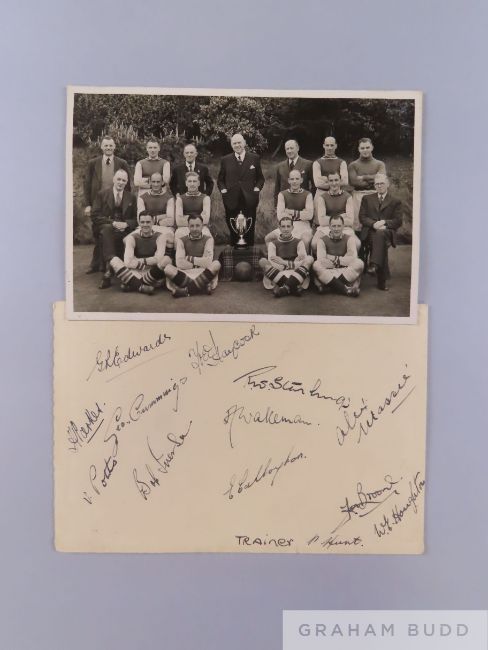 Black and white Football League (North) War Cup Winners team line-up photograph, May 1944, the back of the mount bearing thirteen autographs including Cummings, Edwards, Parkes, Potts etc and trainer Hunt, 10.5 x 16cm