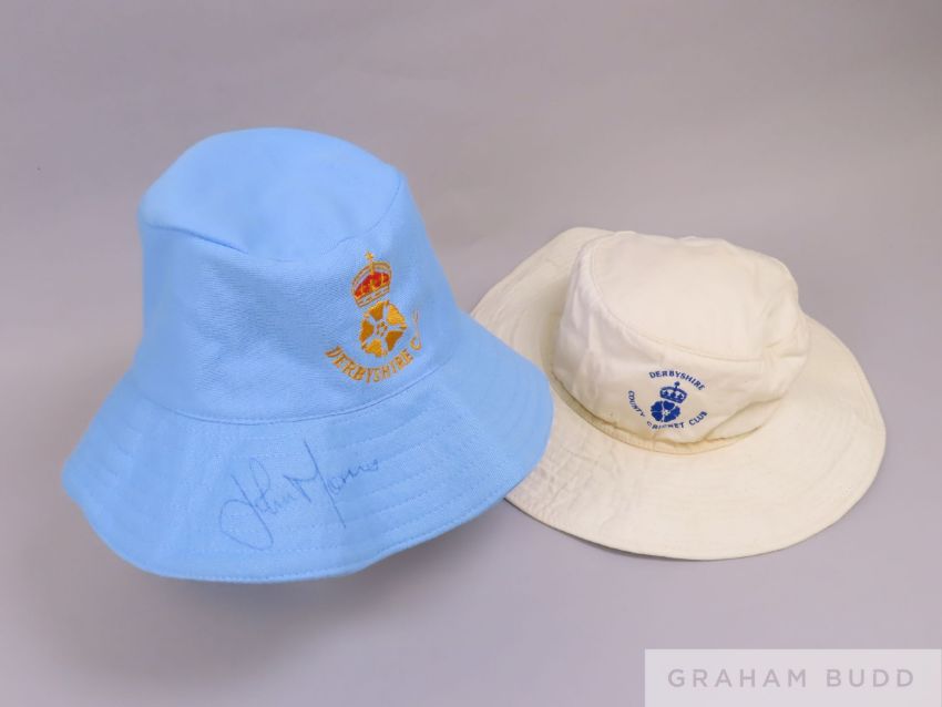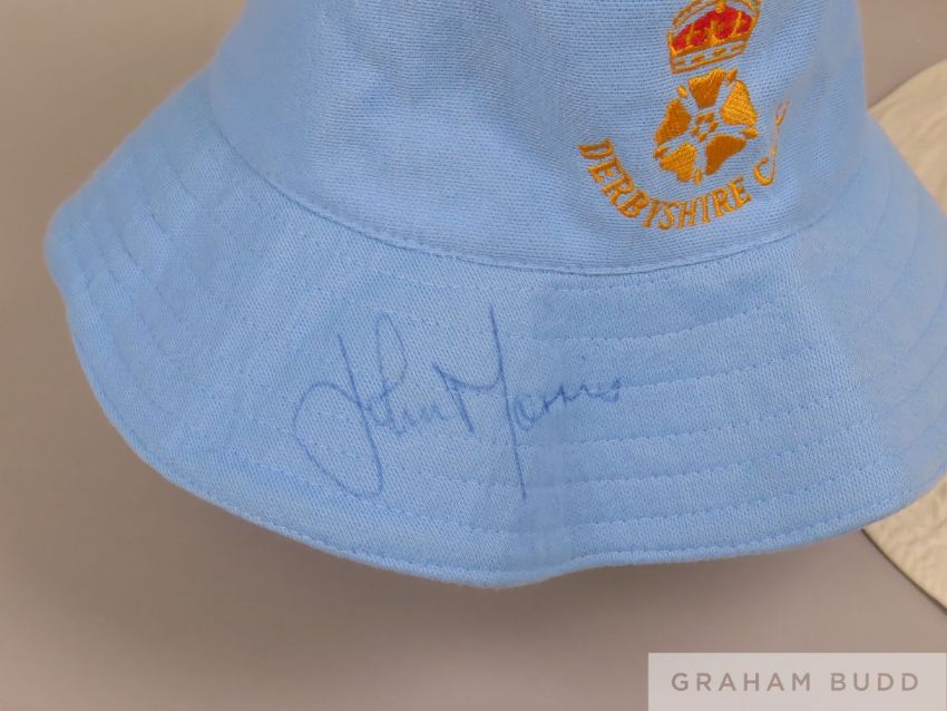 A collection of Derbyshire CCC kit, including a white cotton match issue sun hat with the Derbyshire CCC logo embroidered in blue on the front; a white a home shirt manufactured by Surridge, size XL, with the Derbyshire CCC crest sewn onto the front, signed in black pen and edged in light blue; a Derbyshire Panthers shirt, manufactured by Crusader, size L, in light blue with dark blue and yellow trim and Marston's Pedigree slash to the left sleeve, is numbered 14 on the back and lettered LUNGLEY in dark blue; a Derbyshire CCC sun hat in light blue cotton with the Derbyshire CCC logo embroidered on the front in gold and a Derbyshire CCC T shirt. size L, in white cotton with the Derbyshire CCC logo to the front, (qty) The blue sun hat is signed on the rim in blue pen, the blue shirt is signed on the front in black pen by Tom Lungley to David, and the white shirt is signed to the front in black pen by members of the Derbyshire CCC squad.