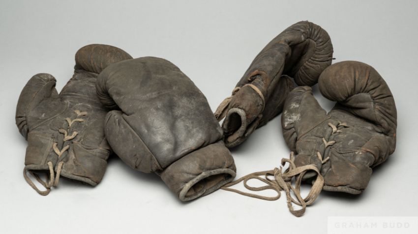Jack London Snr v. Bruce Woodcock, two pairs of vintage boxing gloves, 1940s the gloves are believed to have been worn Jack London Snr and Bruce Woodcock in the British Heavyweight Title & Commonwealth (British Empire) Heavyweight Title at White Heart Lane, the gloves were won by the vendor's grandfather at a raffle immediately after the fight, both pairs in poor condition, dirty, dried and cracked, (2 pairs)