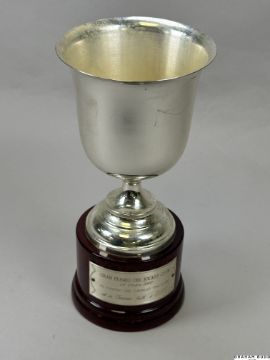 In the form of an Italian electroplated goblet by Franco Bosi, mounted on a wood-effect base set with plaque with race inscription, height 23cm., good condition