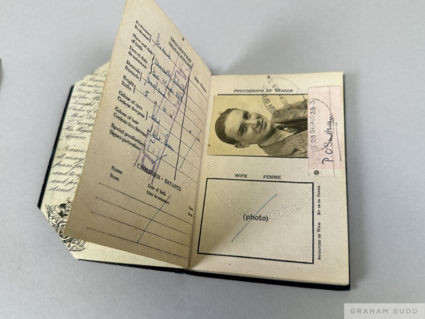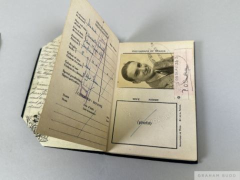No.53499, to the bearer Mr. Peter John O'Sullevan, occupation Student, place of birth Newcastle Ireland, domiciled England, height 5ft. 10in., colour of eyes Grey, colour of hair Light  Brown, signed by Peter O'Sullevan beneath his photo ID, expiry date 23rd September 1940, visa stamps for France, Sweden, Yugoslavia, Austria, Iceland, Norway, Germany in 1939(!), Eire and Switzerland, cancellation tear to top right-hand cover board; sold with an original 10 by 8in. b&w press photograph of Peter O'Sullevan in his early broadcasting days (2)