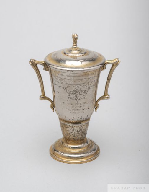 In the form of a gilt two-handled cup & cover, with Royal Hong Kong Jockey Club race presentation inscription, height 15cm., gilding worn