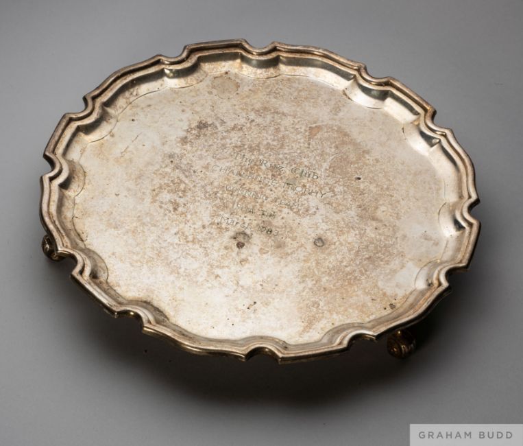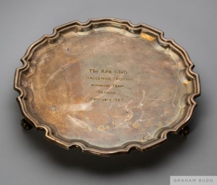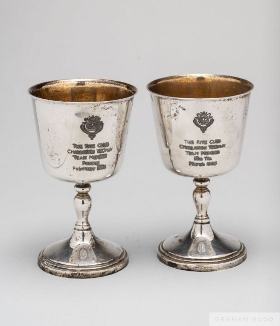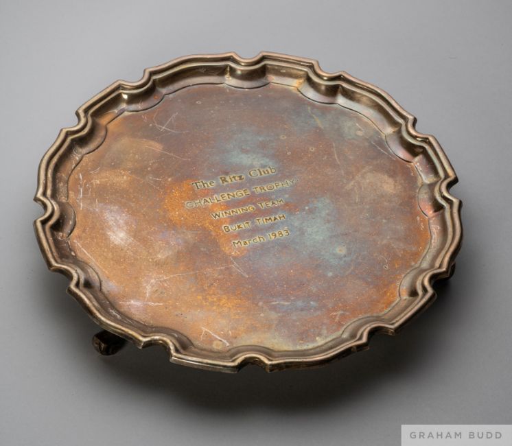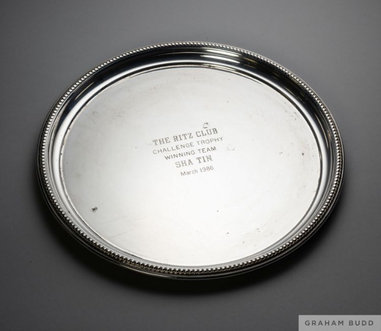 comprising: four salvers, Sha Tin, Hong Kong, in 1983 and 1986; Penang, Malaysia, 1983; and Bukit Timah, Singapore, 1983, all in the form of electroplated silver salvers inscribed with the competition details, mostly diameter 21cm., one 23cm., minor surfaces scratches, mostly in need of cleaning; and two electroplated team member goblets, Penang 1986 and Sha Tin 1986, height 14cm., minor surface pitting