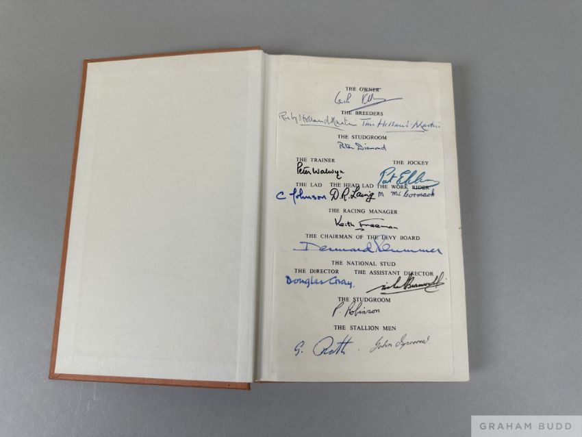 with laid down autograph sheet to front end paper signed by the owner Carlo Vittadini, the breeders the Holland Martin's from the Overbury Stud, the trainer Peter Walwyn, the jockey Pat Eddery, and other signatures including The Lad, Head Lad, Work Rider, Racing Manager, Chairman of the Levy Board, National Stud Director and Assistant Director, the Studgroom and the Stallion men