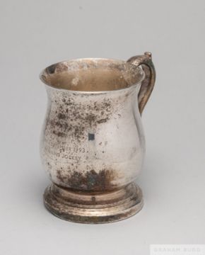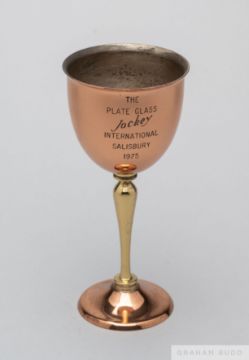 In the form of a silver-plated mug inscribed with race details, ding to base; sold with another item of Salisbury racecourse interest, a two-colour gilt-metal goblet presented to jockey Pat Eddery on the occasion of the Plate Glass International at Salisbury in 1975, inscribed with details to bowl, height 17cm. (two items)