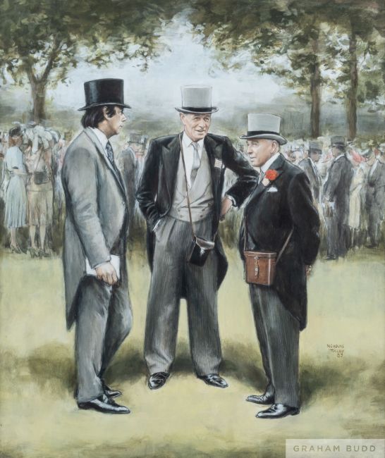 Painted two years after the passing of Sir Noel Murless, the artist has painted Mr Joel with two of his principle flat race trainers, the other Henry Cecil, both masters of the Warren Place stables in Newmarket.