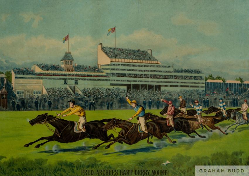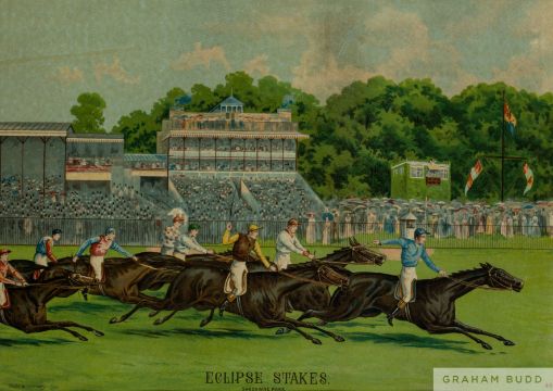 Pair of 1886-published German chromolithographs depicting Fred Archer's last Epsom Derby win on Ormonde; and the inaugural running of the Eclipse Stakes at Sandown Park won by Bendigo,