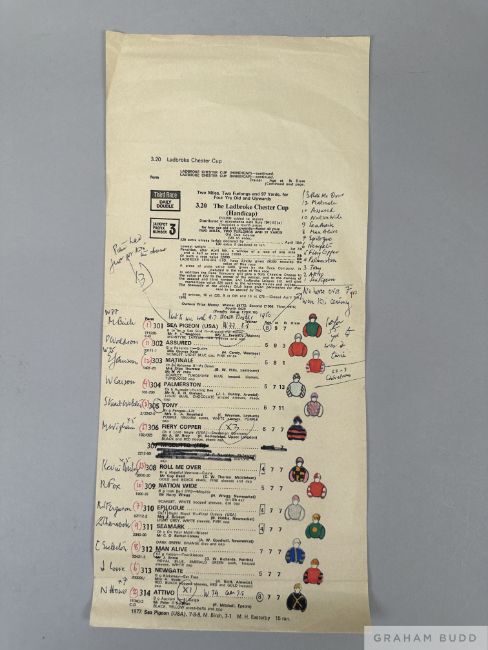 Sir Peter O'Sullevan's BBC commentary card for the 1978 Chester Cup won by the outstanding dual-purpose racehorse Sea Pigeon,