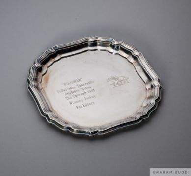 In the form of a small boxed electroplated square-form dish, engraved with a racehorse and jockey and inscribed with race details, 14.5cm. square, minor surface scratches