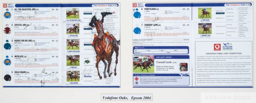 2004 Epsom Oaks racecard signed by the competing jockeys and with a portrait of Ouija Board and Kieren Fallon painted by the Newmarket artist Jacqui Jones,