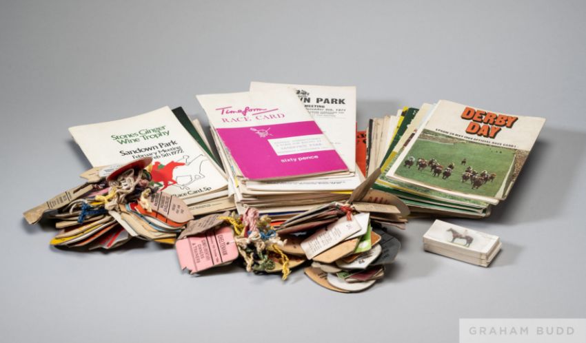 racecards including 1968 Derby, 1972 Cheltenham Gold Cup, 1972 & 1973 Champion Hurdles, 1972 & 1973 Champion Chase Day and 1973 Triumph Hurdle Day;  Whitbread Gold Cups for 1967, 1968 (x 2), 1969 & 1970; 1967 Eclipse Stakes (x 2); also three [now defunct] Alexandra Palace 1968 racecards; other content from the same era and mostly Sandown, also Newbury, Ascot and others including Tralee in Ireland (approx. 56); sold together with a qty. of cardboard day passes, mostly 1980s; other items inclusing Players Derby & Grand National winners cigarette cards (a qty.)