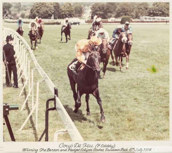 i) Polygamy winning the Oaks at Epsom in 1974; ii) Coup De Reu winning the Eclipse Stakes at Sandown Park in 1974; and Primo Valentino winning the Middle Park in 1999, signed by Pat Eddery and signed again to the backboard, water damage, various sizes