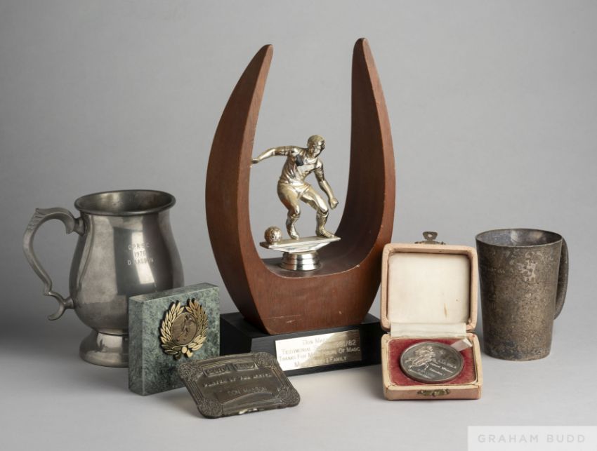 Don Masson white-metal Professional Footballers Association medal the obverse inscribed PROFESSIONAL FOOTBALLERS ASSOCIATION, the reverse inscribed ALL STAR, Award Winner Division 1, D. Masson, Queen's Park Rangers, in original fitted case, case in poor condition, QPR tankard, inscribed Q.P.R. SC, 1976 D MASSON, 14cm high, Gatty Skelly Player of the Match belt buckle inscribed DOM MASSON, Testimonial trophy from Mike Disney and Family another tankard and medal mounted on marble