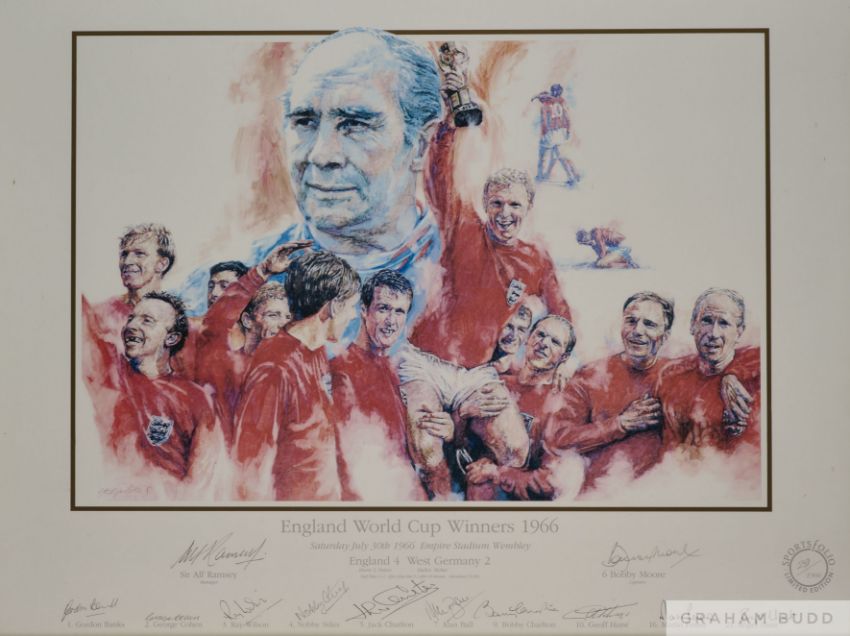 England World Cup Winners 1966 signed print, signed in pencil by the 11 players and Sir Alf Ramsey, Sportsfolio Limited Edition 29 of 1966, glazed and framed, 64 x 84cm The following Lots 328 to 354 are the property of David Dein MBE, former co-owner and vice-chairman of Arsenal FC and former vice-chairman of the F.A. The lots are being offered for Charity and all proceeds will be donated to The Twinning Project charity which David set up connecting football clubs with prisons helping rehabilitate prisoners.