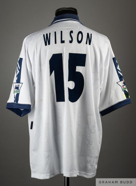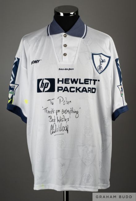 Clive Wilson white and blue No.15 Tottenham Hotspur match issue short-sleeved shirt, 1995-96, Pony, 46-48, with button-up collar and embroidered cloth badge inscribed THFC, Audere-Est-Facere, the front of the shirt dedicated and autographed To Peter, 'Thanks for Everything' Best Wishes Clive Wilson, the reverse lettered WILSON, the sleeves with The F.A. Premier League flashes, the right sleeve with staining from highlighter pen The 1995-96 season was the first season of the Pony shirt deal and Hewlett Packard shirt sponsor