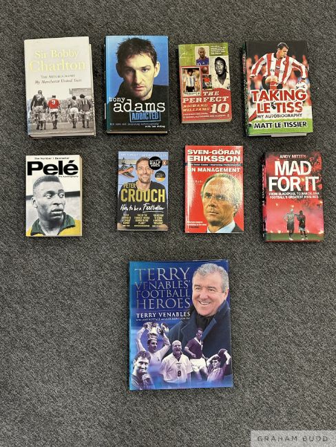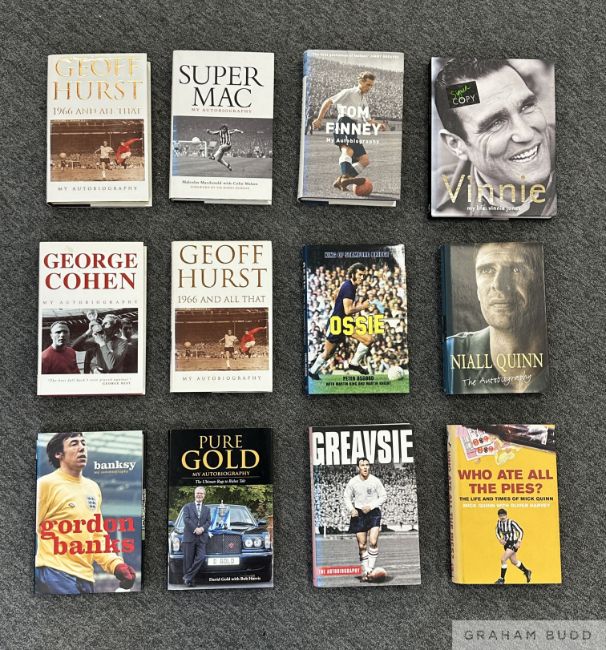A mixed box of football related books.  many of them signed, including titles relating to Sir Geoff Hurst, George Cohen, Terry Venables and Niall Quinn (21)