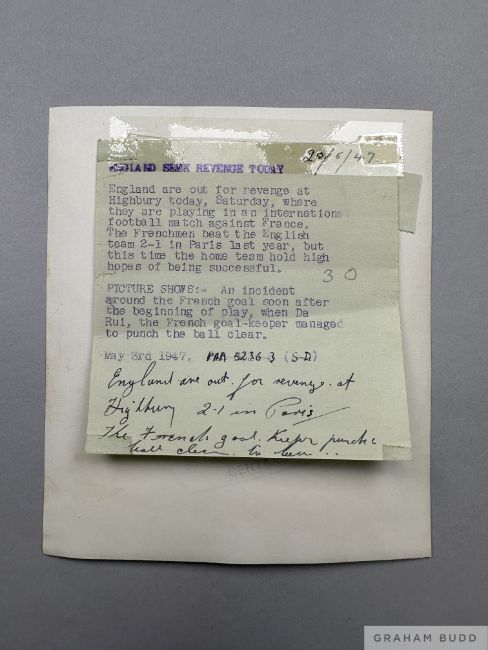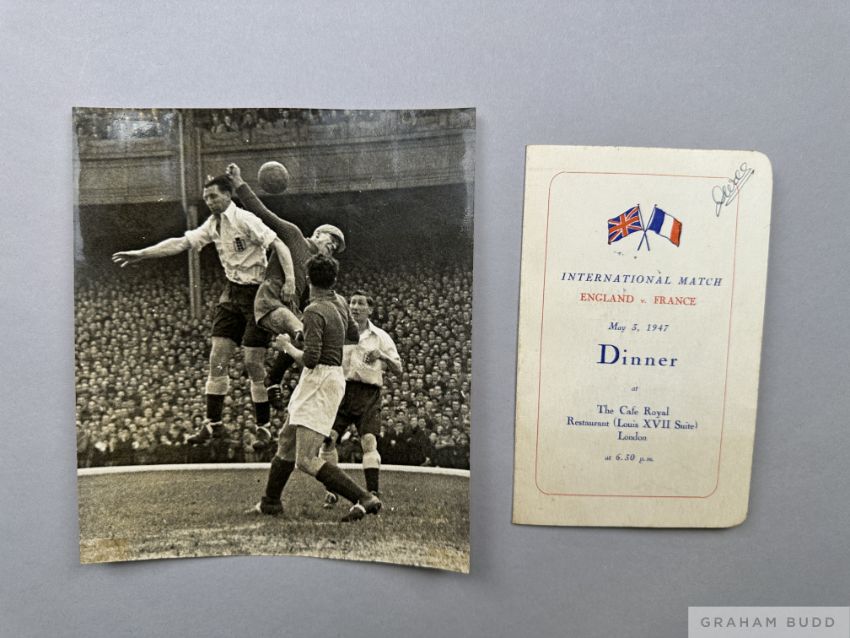 England v. France autographed menu card, 3rd May 1947 at The Cafe Royal, the back cover bearing fourteen autographs including George Hardwick, Tommy Lawton, Billy Wright, Tom Finney etc, with removed from scrap book, toast page poor and press photo of the match (2)