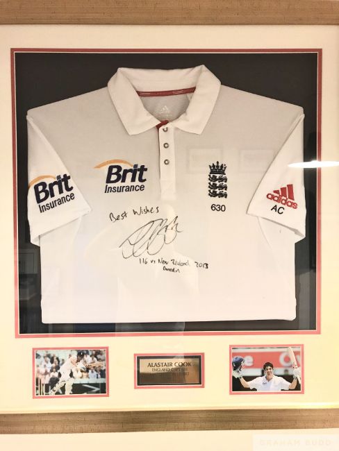 Alastair Cook match worn England Cricket shirt, 2013 signed “Best Wishes Alastair Cook, 116 v New Zealand 2013 Dunedin” Cook captained England during the drawn 2012/2013 series in New Zealand, he scored his 24th century for England in the second innings at Dunedin, the shirt is embroidered with Cook’s England number 630 and his initials “AC” on the left sleeve The shirt was donated by Cook to Stephen Peters in his 2013 Benefit year, the players having been teammates at Essex. The shirt was purchased by the current vendor during a dinner at the Oval in 2013 and presented by Cook, framed and glazed to conservation standard.