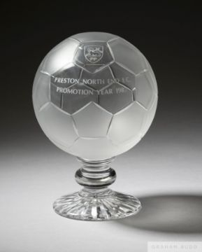 Preston North End Royal Doulton commemorative 1987 promotion glass football by Webb Corbett, etched with club badge and PRESTON NORTH END F.C. PROMOTION YEAR 1987, 8in. high in original box and Presentation dinner dance menu card, 18th July 1987 (2)