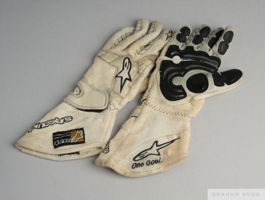 Pair of Christian Klien Honda used test gloves by Alpinestars with FIA 8856-2000 label