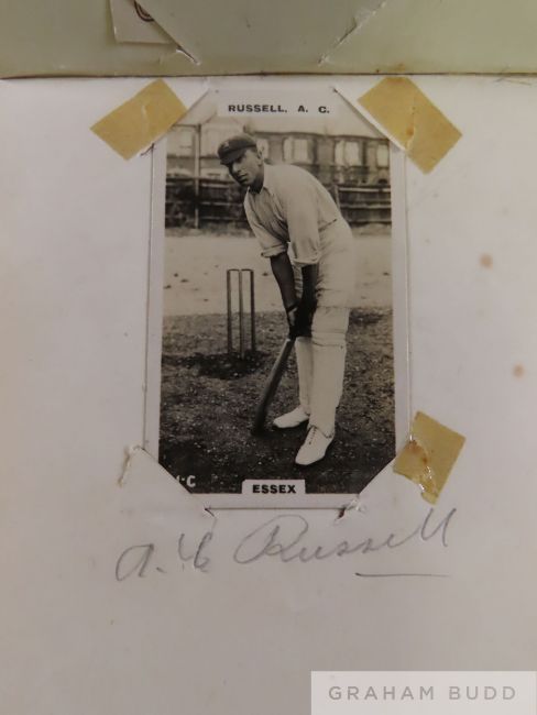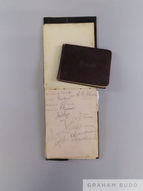 An album of cricket autographs, circa 1920s including Jack Hobbs, A.G. Russell, J. Douglas, C. Mead, Strudwicks, G. Collins the album containing small collection of various Young Britain cricket cards and another partial signed cricket autograph album (2)
