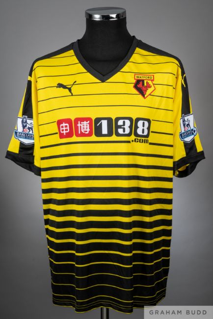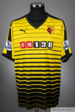 Troy Deeney yellow Watford no.9 home shirt from the 2015-16 season game v Arsenal that took place at Vicarage Road on 17/10/2015. Player issued short sleeved PUMA example with the Barclays Premier League badge on both sleeves. The front has the Watford Club crest and the 138.COM sponsor logo. The PUMA marketing trademark is present in black. The back is lettered DEENEY, bears the squad no.9 and is a UK size L. The game ended in a 3-0 win for Arsenal with goals scored by Sanchez, Giroud and Ramsey. Troy Deeney was  Captain for the Hornets for the game, which was a 5.30pm kick off time.