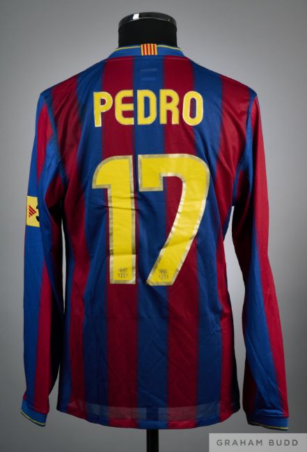 Pedro garnet and blue No.17 Barcelona match issue long-sleeved shirt, 2009-10, Nike, M with v-neck collar and embroidered cloth badge inscribed FCB with FIFA WORLD CHAMPIONS 2009 badge, the reverse lettered PEDRO, the right sleeve with La Liga LFP flash