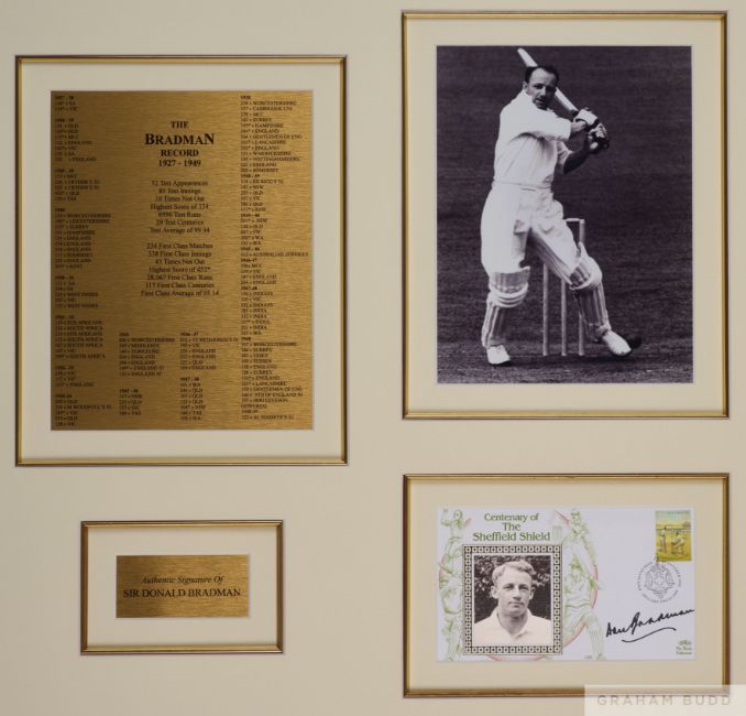 Don Bradman autographed display with black and white image of him batting and career stat info in common-mount, framed and glazed, 29 x 29in overall with COA from Rare Memorabilia