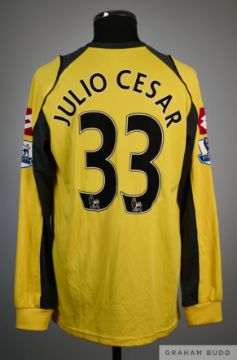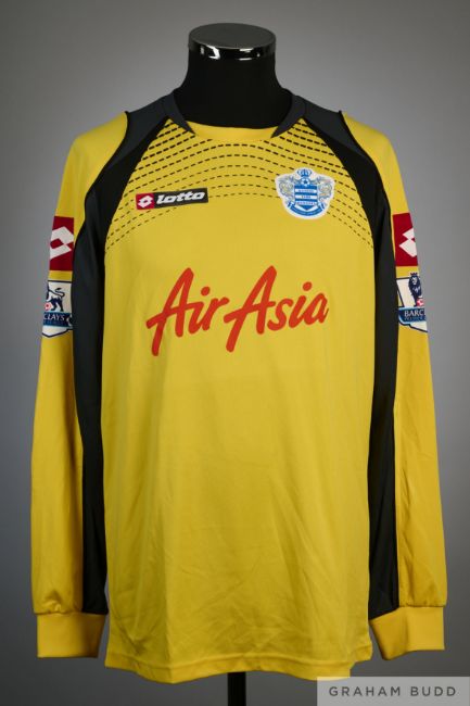 Julio Cesar yellow and black No.33 Queens Park Rangers v. Sunderland long-sleeved goalkeepers shirt, 2012-13, Lotto, L with crew-neck collar and embroidered cloth badge inscribed QUEENS PARK RANGERS, LOFTUS ROAD LONDON 1882, the reverse lettered JULIO CESAR, the sleeves with Barclays Premier League flashes