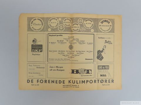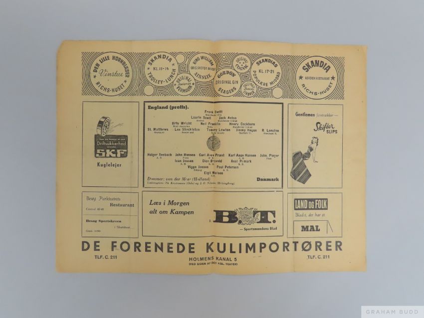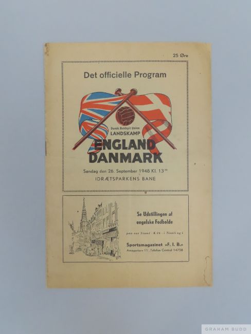 Denmark v England International match programme,  26th September 1948 match played at the Idraetsparken, Copenhagen, signs of folds, some staining
