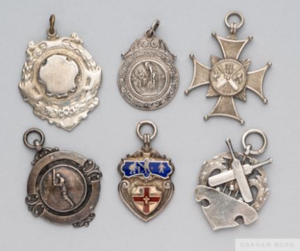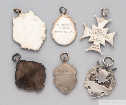 Five silver cricket medals, including a Lincoln League from 1900, hallmarked, in original Vaughton and Sons box and presented to F Gunson, (5)