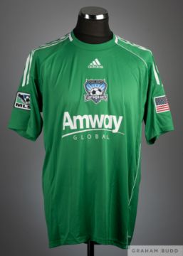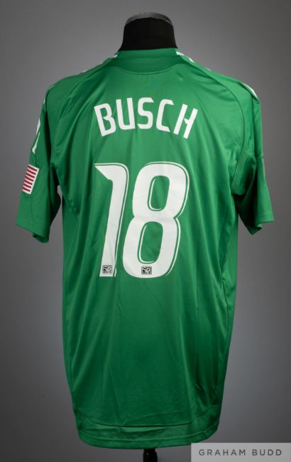 Jon Busch green No.18 San Jose Earthquakes match issued goalkeepers short-sleeved shirt, 2010-11, Adidas, L, with crew-neck collar and printed badge, the reverse lettered BUSCH, the right sleeve with MLA flash and the left sleeve with Stars & Stripes flash In the match played on 17th July 2010, neither team could find the net, the match ending 0-0