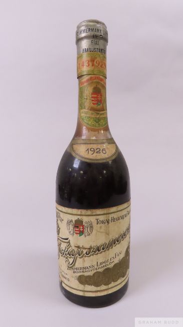Produced by Zimmerman Lipot Es Fiai, Abauj-Szanto. Neck label serial number "437929". Embossed lead capsule with small scratched section to front. Labelling with some discoloration. Neck label scratched top right edge, main label scratched and creased top right edge and bottom left quarter. 0.5 litre. Level: mid shoulder