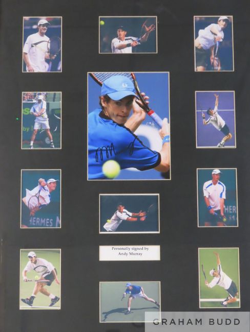 featuring a central photograph signed in black marker pen, flanked by 11 further action photographs, mounted, glazed and framed, 90 x 68cm.