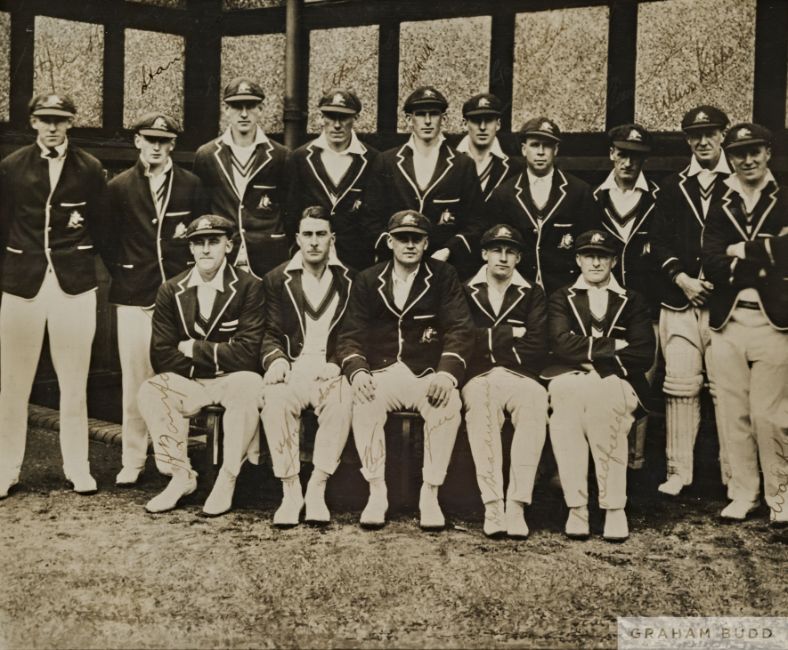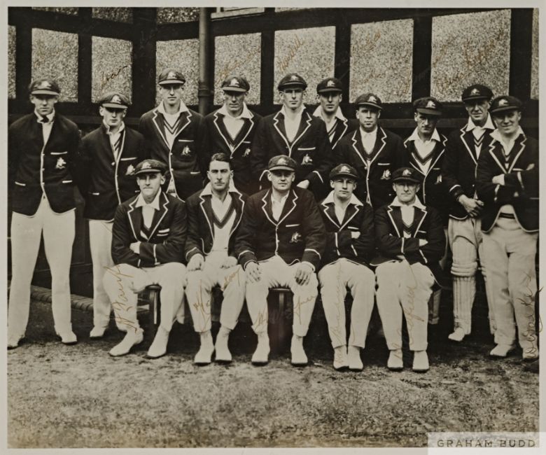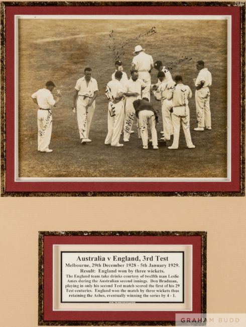Signed photograph of the England cricket team from the 3rd Test v Australia at Melbourne, 29th December 1928 - 5th January 1929, b & w photograph depicting the England team during the drinks interval in the Australian innings, signed in black ink by Harold Larwood, Maurice Tate, George Geary, Jack Hobbs, Les Ames, Patsy Hendren, George Duckworth, Herbert Sutcliffe, Wally Hammond, Douglas Jardine and JC White above legend, mounted, glazed and framed, overall size 50 x 43cm., England defeated Australia by three wickets and retained the Ashes winning the series 4-1; sold together with two further black in signed b&w photographs of the Australian team touring England 1930, each mounted, glazed and framed, 36 x 40cm. and 39 x 43cm., (3) Please be aware all glass will be removed from framed and glazed items prior to posting and may result in delays to shipping your items. (This service is included in the cost of postage and packing). We can also totally remove all framing and mounts upon request to reduce shipping costs. Alternatively lots can be collected in person by prior appointment from NN8 1RT.