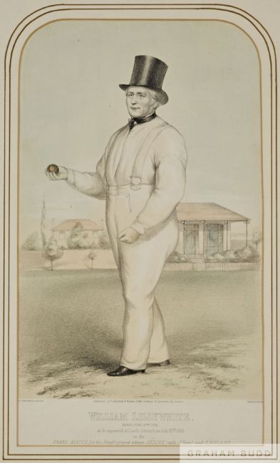 William Lillywhite at Lord's ground on July 25th 1853 in Grand Match for his Benefit played between Sussex and England, by Richard Black, lithograph drawn by John Corbet Anderson, published by Fred Lillywhite & John Wisden, London in 1854, mounted, glazed and framed, 51 x 41cm. All glass will be removed from framed and glazed items prior to posting and may result in delays to shipping your items. (This service is included in the cost of postage and packing). We can also totally remove all framing and mounts upon request to reduce shipping costs. Alternatively lots can be collected in person by prior appointment from NN8 1RT.