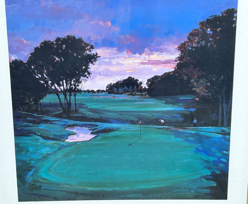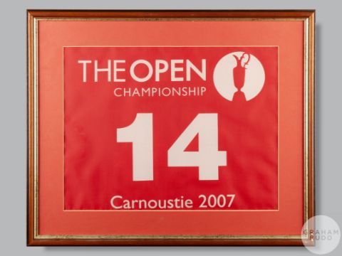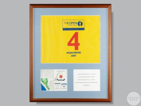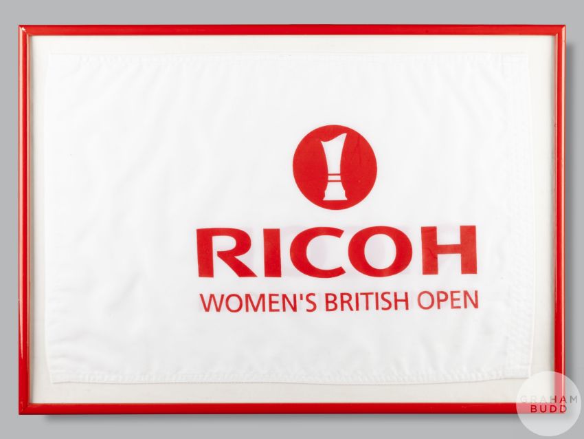 Three various golf flags comprising Local Open Championship qualifying, Montrose 2007, framed with David Shacklady signed scorecard,  2007 Carnoustie, No.14, Ricoh Women's British Open, print of Bobby Jones, St Andrews Old Course print and large golfing print (6) Provenance: The Royal Montrose Mercantile Golf Club, being sold on behalf of the club to raise funds for club house refurbishment, Lot 1 to Lot 22