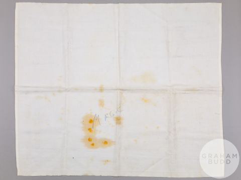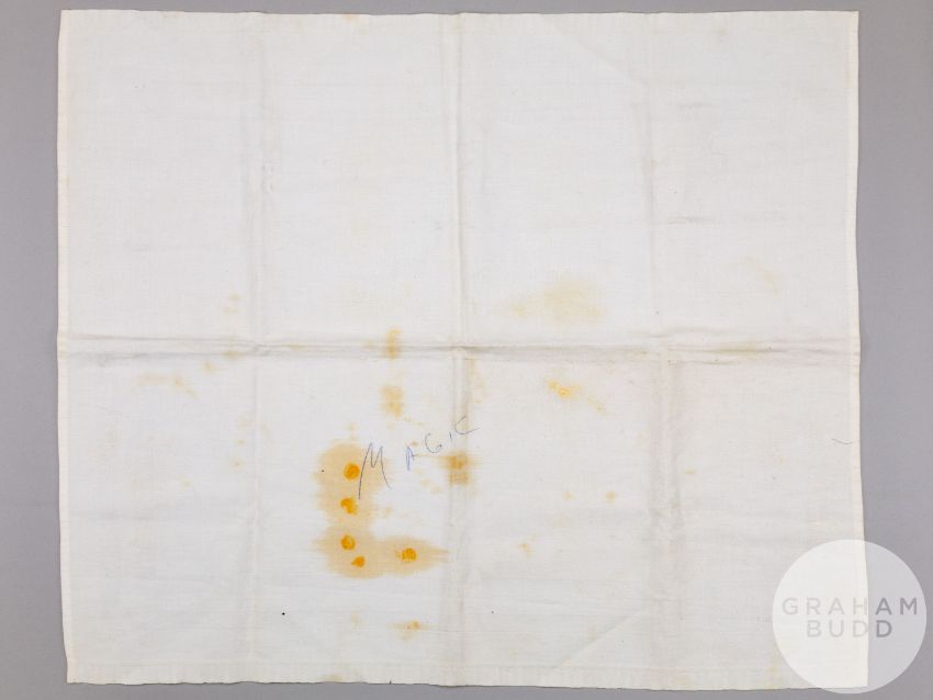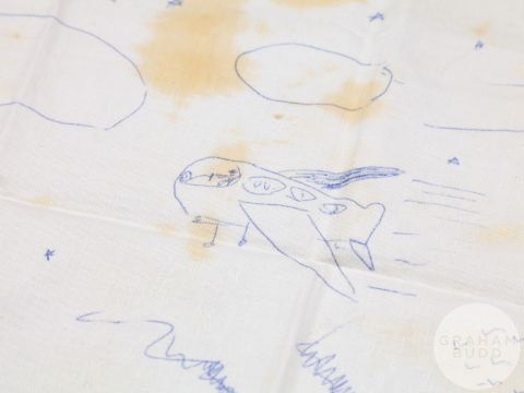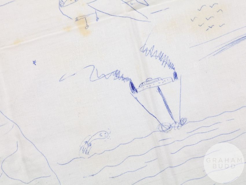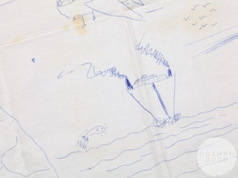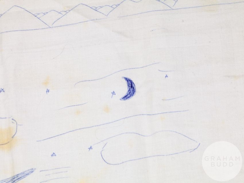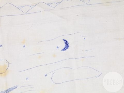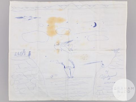 signed and dated January 3-1987, the artwork drawn on damask table cloth with areas of food staining, blue ink drawing, 19.5 x 23in., the reverse of the table cloth inscribed in ink MAGIC, slightly faded