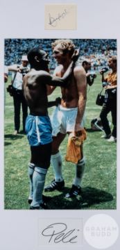 Bobby Moore and Pele double-signed 1970 World Cup shirt swap framed photographic display,